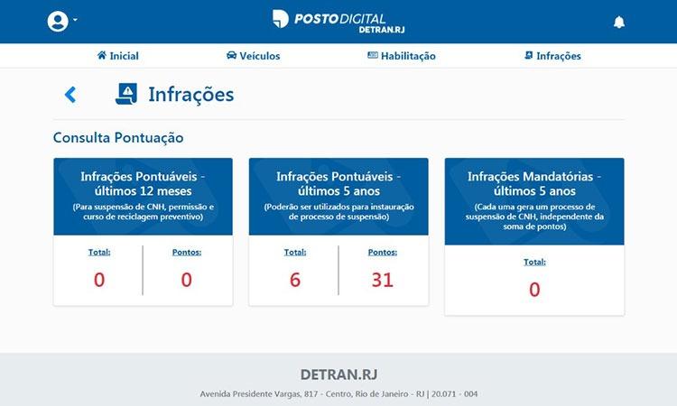 * Em relação às infrações de trânsito, poderá consultar quantos pontos recebeu nos últimos 12 meses e que podem ser usados para a suspensão da CNH, assim como o número de pontos dos últimos cinco anos. No Posto Digital, há ainda um quadro específico para as infrações mandatórias - como são chamadas as que, pela sua gravidade, são punidas com a suspensão da carteira, independentemente da soma de pontos alcançada pelo condutor.
