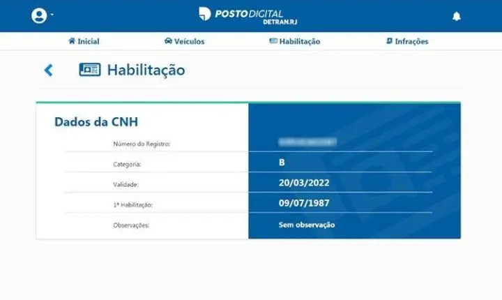 * Na área de habilitação, poderá consultar o número de registro, a categoria e a data de validade de sua CNH. O usuário também receberá notificações 90, 60 e 30 dias antes da data de vencimento, o que vai permitir que ele se programe para a renovação;