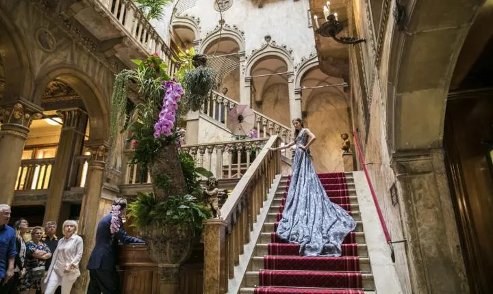 Entre as peças nascidas no ateliê localizado no charmoso bairro do Naviglio e selecionadas para a apresentação, está o vestido de tule, com uma ousada combinação de pêssego, amarelo e roxo, usado pela modelo Alessia Acquarone, durante a primeira participação de Jenny no red carpet do Festival de Cinema de Veneza em 2018, e desde então suas criações estiveram presentes em todas as edições. Outro destaque nessa viagem entre lembranças é o suntuoso vestido de tule azul elétrico que outra atriz, Melania Dalla Costa, exibe na capa da Glamour Mexico. E como não incluir um dos looks criados ad hoc para a consagrada pianista Gloria Campaner para seus